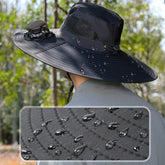 【Breathable Fabric + Waterproof Coating】Crafted from lotus leaf-inspired splash-proof fabric, our hat with fan instantly dries with a shake. The wide brim solar fan hat can handle unpredictable summer weather, keeping you dry and comfortable.
