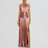 New Solid Pleated Sexy Hollow Halter Split Long Party Dress