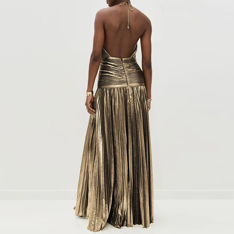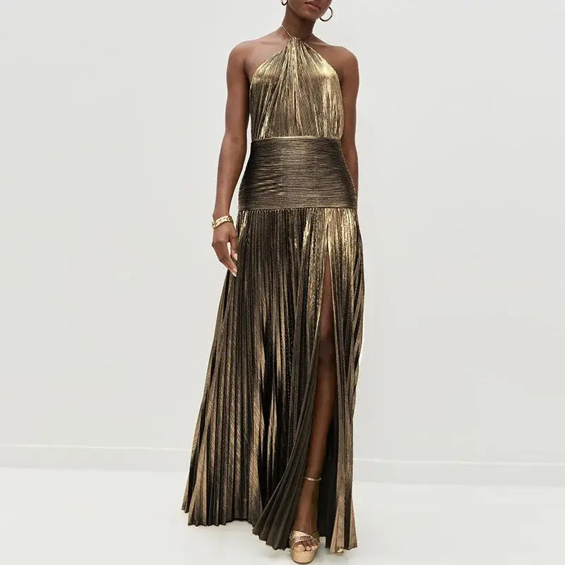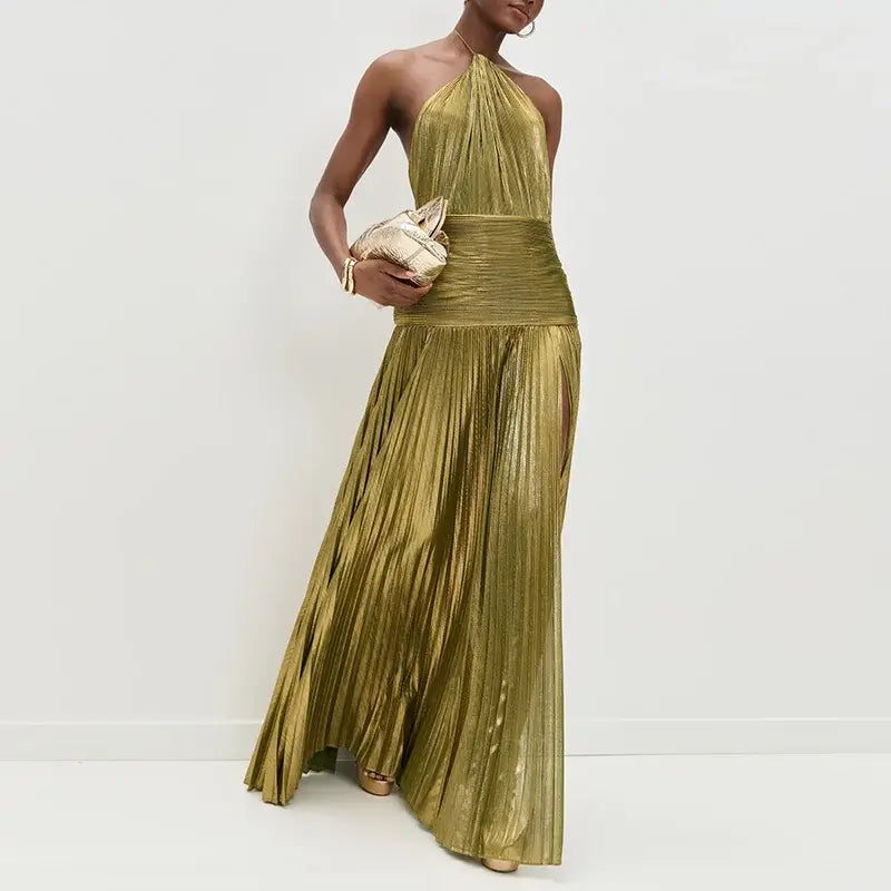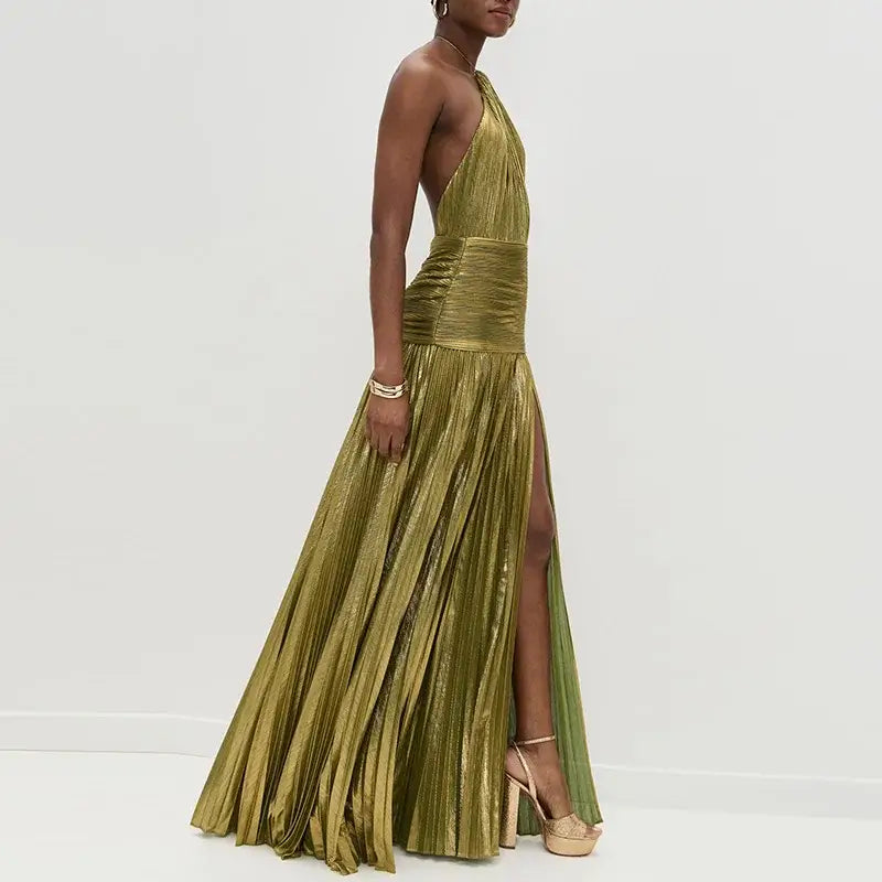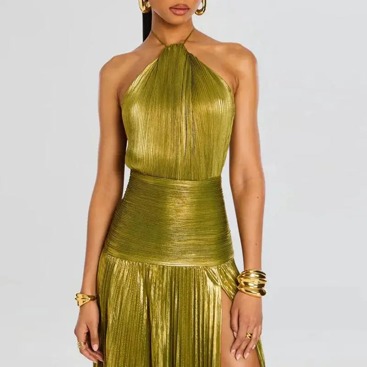 New Solid Pleated Sexy Hollow Halter Split Long Party Dress
